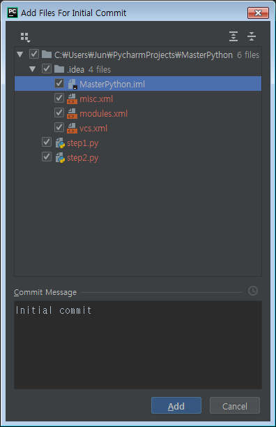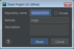 Repository Name은 Default로 현재 Pycharm 프로젝트이름이나 변경하면 변경분이 Github에 올라갑니다.