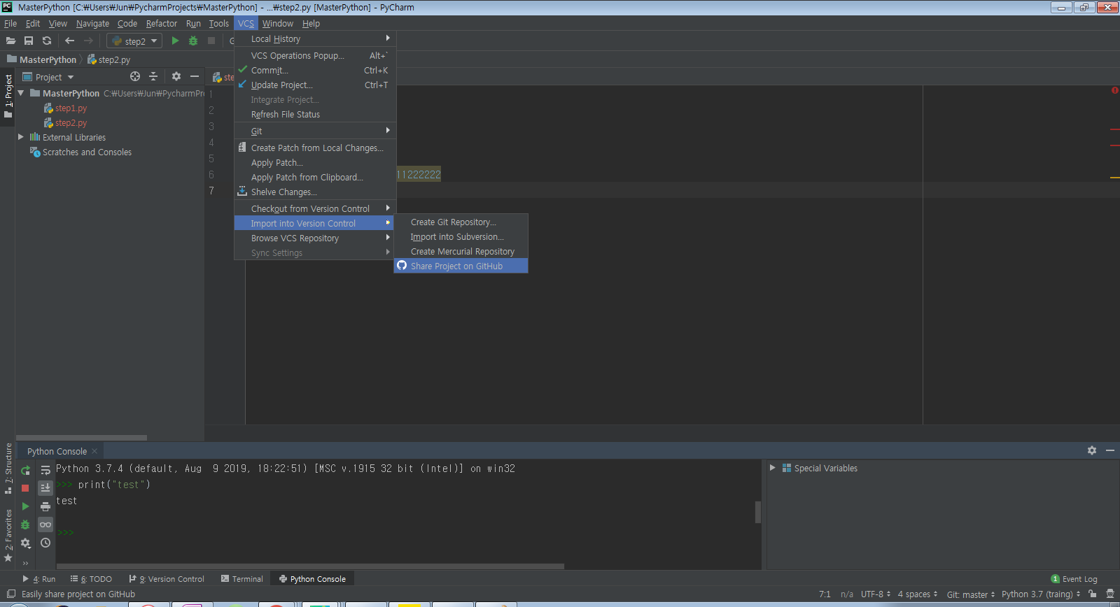 2.Github에는 없지만 Pycharm에 이미 생성된 프로젝트를 옮기는 방법