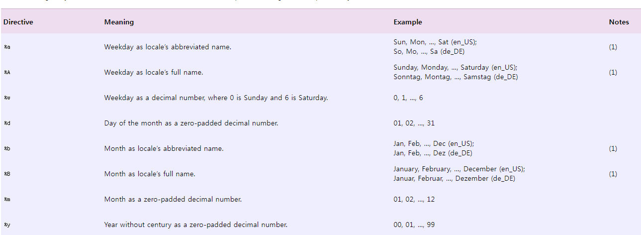 str 타입으로 변환과정에서 변환 포맷을 지정할 수 있는데 이때 필요한게 지정문자 (%A %d %B %Y와 같은)입니다.
