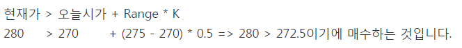여기서 Range는 전일 고가 - 전일 저가이며 K는 0.5를 사용하는 것이 좋다고 하시지만