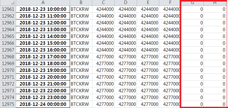 그럼에도 거래량이 0인지 확인하는 이유는 엑셀을 자세히 보면 거래량이 비어있는 잘못된 구간이 있습니다.