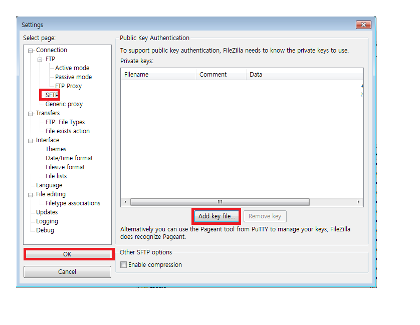 > 10.1 FileZila 상단 Edit에 있는 Setting 메뉴를 키고 좌측 트리메뉴에서 SFTP > Add Key File을 눌러 5.2에서 저장한 키파일을 불러옵니다.