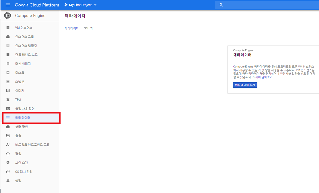 6. 구글 클라우드 콘솔에서 메타데이터를 누릅니다.