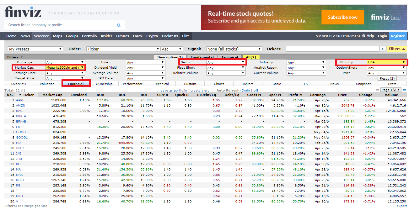 미국 우량주 검색을 위해 다음과 같이 필터링
