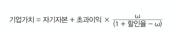 기업가치 = 자산가치 + 초과이익의 현재가치 = 자기 자본 + 자기자본*(ROE-할인율)/할인율