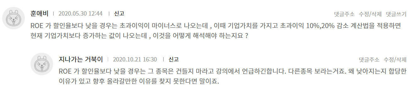 이렇게 된 이유는 ROE가 할인율보다 낮아지게 되어서 초과이익이 (-)가 되는 경우 발생한다.