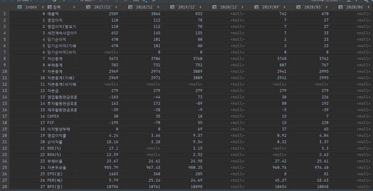 local db에 저장해둔 재무, 실적 정보는 이렇게 생겼다.