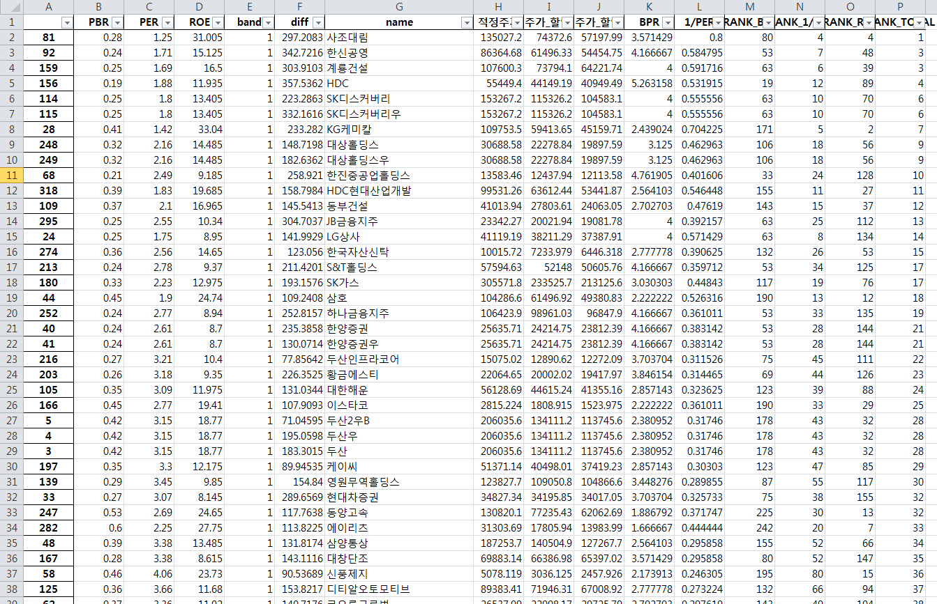 이렇게 현재 초과이익을 기준으로한 기업 가치보다 종가가 더 싼 300여개의 기업들을 추려내 PER, PBR, ROE를 합산한 랭킹을 매긴다.