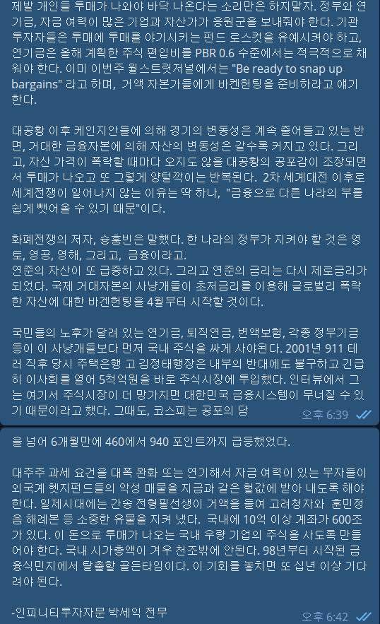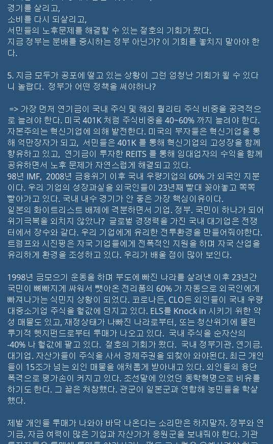 7. 국민들의 노후가 달려 있는 연기금, 퇴직연금, 변액보험, 각종 정부기금등이 이 사냥개들보다 먼저 국내 주식을 싸게 사야된다.