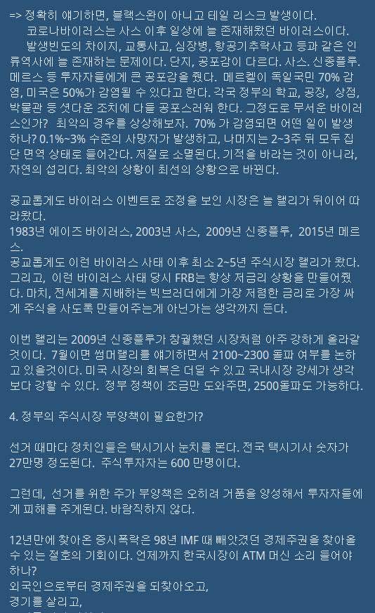 2. 이번 랠리는 2009년 신종플루가 창궐했던 시장처럼 아주 강하게 올라갈 것이다. 정부정책이 조금만 도와주면 2500돌파도 가능하다.