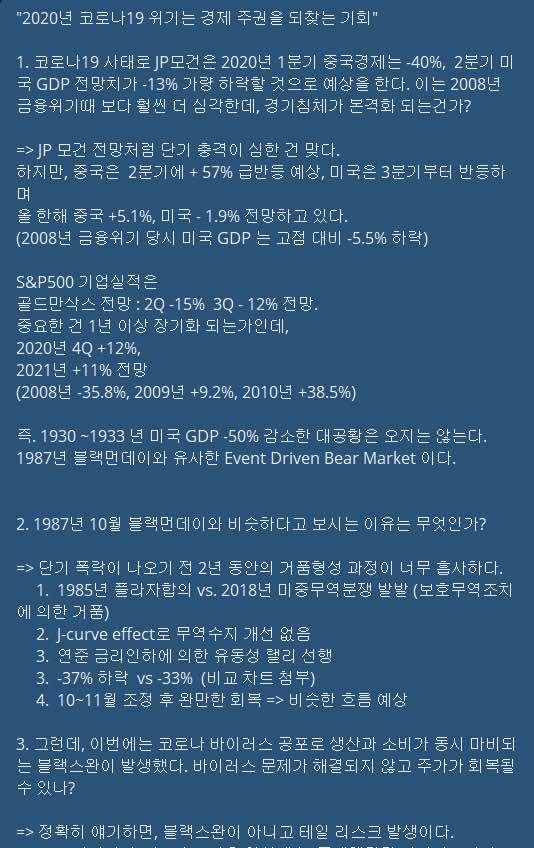 이런것에 대부분의 관심이 가지만 이런 글도 읽어보면 좋을 듯.1. 1930~33년 미국 GDP 50% 감소한 대공황은 오지 않는다. 1987년 블랙먼데이와 유사한 Event Driven Bear Market 이다.2. 이번 랠리는 2009년 신��