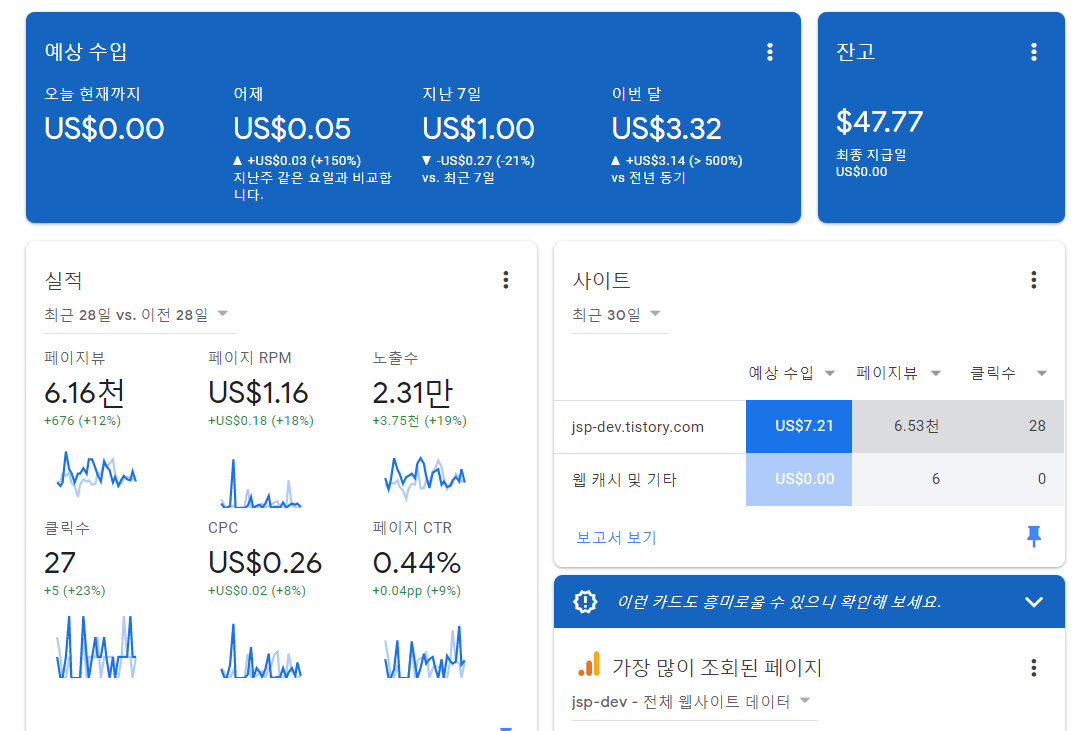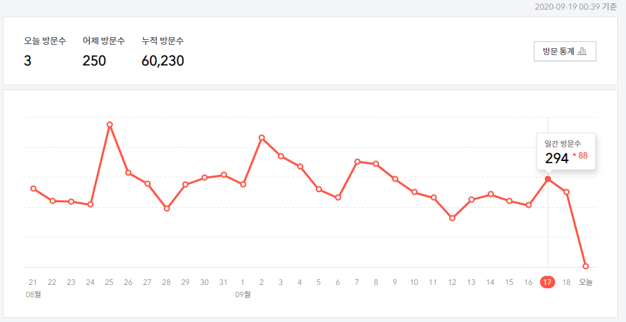 내가 나름 열심히 글을 쓰면 그런대로 방문자가 증가하는 정직한 시스템이라 정~말 꾸준히만 한다면 요즘 유튜브 자주 나오는 '블로그로 00만원 벌기'에 합류할 수 있을 것 같다.