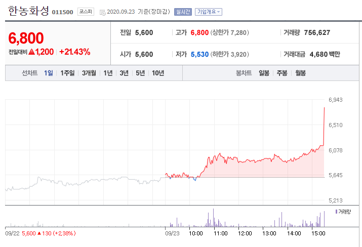 한농화성을 9/22, 5490원에 매수한 다음 현재 엄청나게 올랐다.