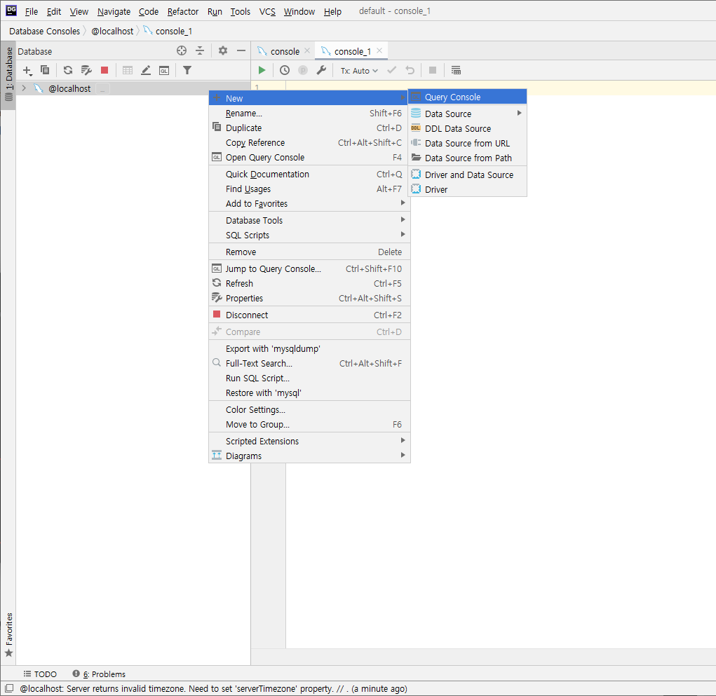 @localhost에서 마우스 우클릭 > new > query console 클릭