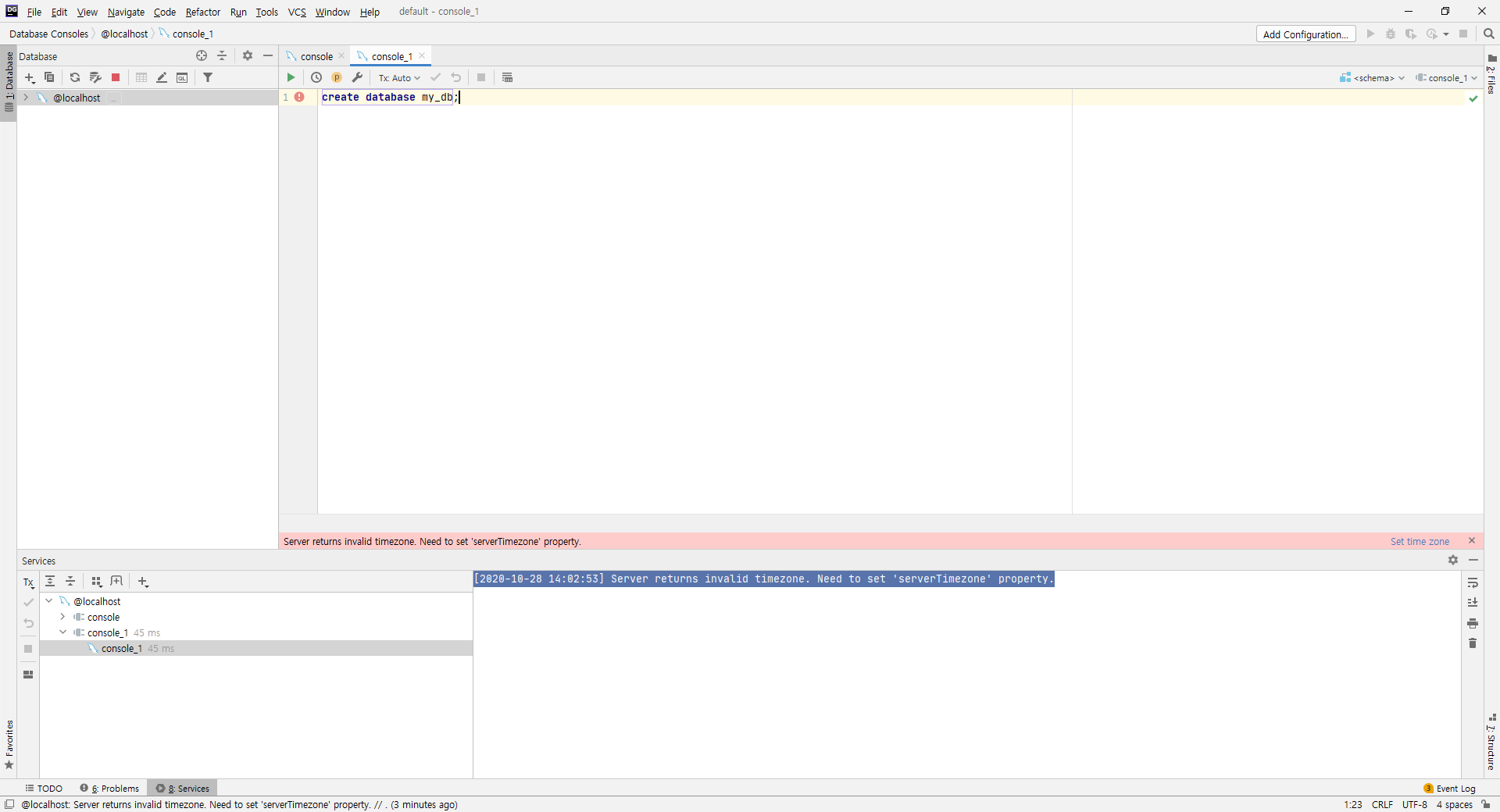 | Datagrip - Server returns invalid timezone. Need to set 'serverTimezone' property. 에러 해결 (0) | 2020.10.28 |