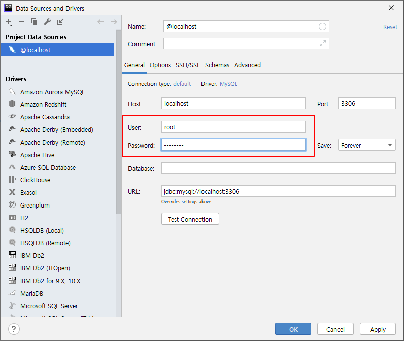 4. mysql의 user id/pw를 입력한 뒤 하단에 OK 클릭