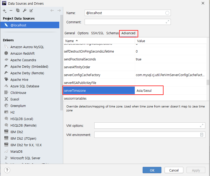 클릭시 나오는 창에서 Advanced > serverTimezone > Asia/Seoul 입력