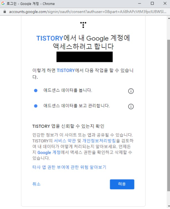 이 버튼을 누르면 구글 계정으로 연동하면서 티스토리에게 구글애드센스 접근 권한을 줄 것이냐고 물어보는데
