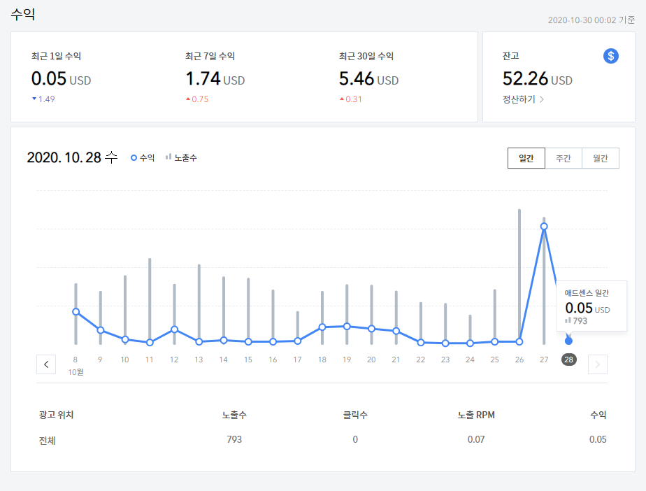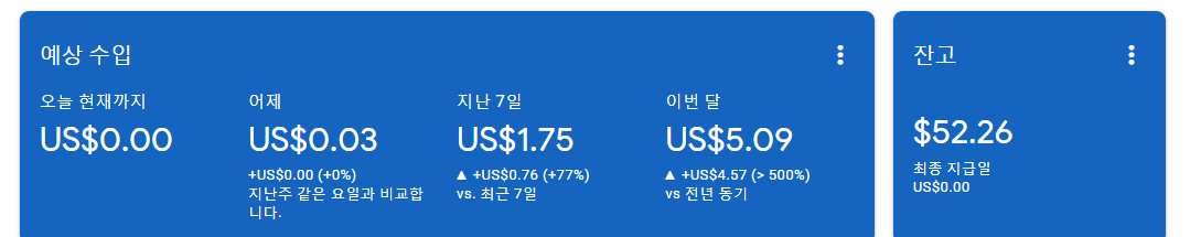 아래 같이 티스토리 관리자 화면에서 바로 실시간 수익 확인이 가능하다.