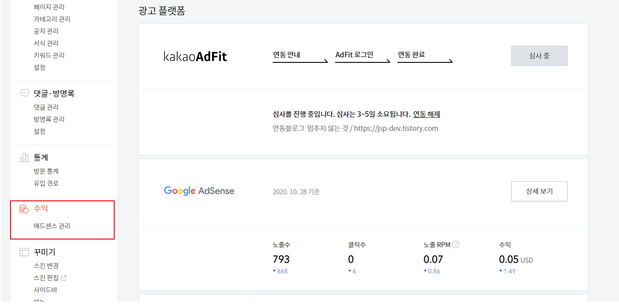 먼저 티스토리 관리자 화면에 들어가면 다음과 같이 수익이라는 관리 카테고리가 생겼는데