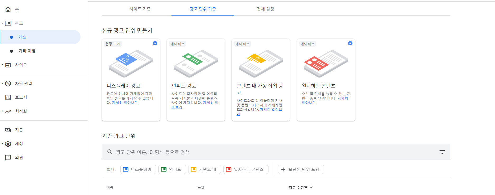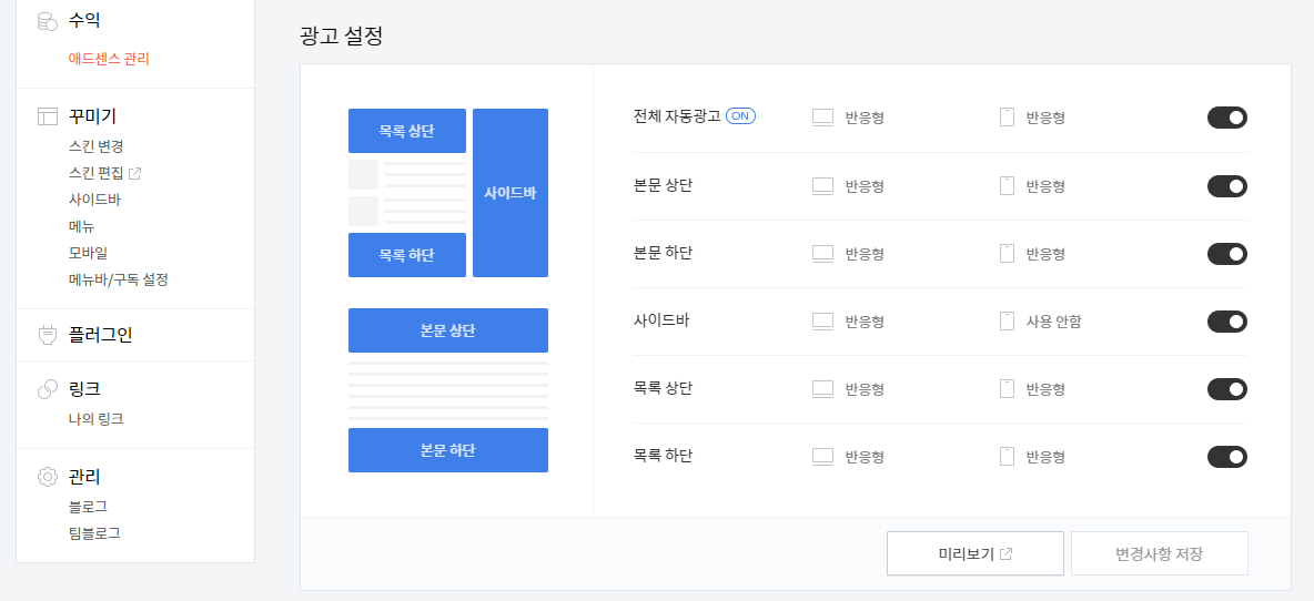 수익 > 에드센스 관리 (연동이 되어야 이 메뉴가 생김) 에서 어떤 광고를 동작 시킬 것인지 말것인지는