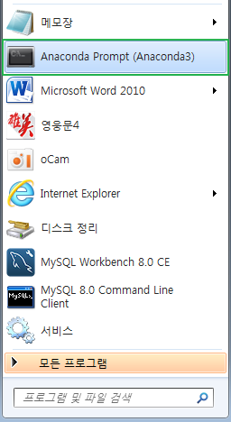 바탕화면이나 시작화면에 보이는 Anaconda Prompt(Anaconda3)를 실행시킵니다.