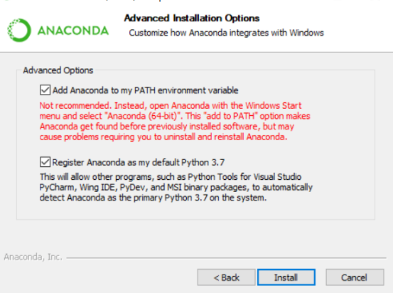 두 번째 옵션인 Register Anaconda as my default Python 3.7도 선택합니다.