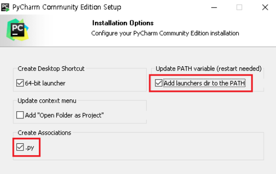 -Add launchers dir to the PATH: Pycharm 실행에 필요한 정보들을 쉽게 사용할 수 있도록 설정하는 옵션입니다. 필수로 선택 해 주시기 바랍니다.