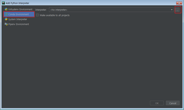 그 다음 창에서 Conda Environment를 클릭하시고 마찬가지로 우측에 ‘…’을 클릭합니다.