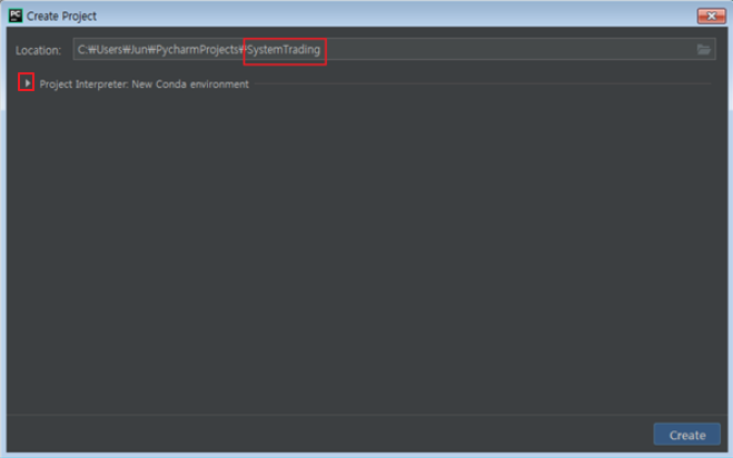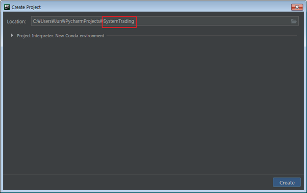 프로젝트 이름은 SystemTrading이라고 지어줍니다.