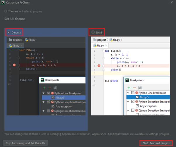 Pycharm을 검은색 테마로 사용할지 흰색 테마로 사용할지 선택하라는 설정입니다. 예시를 보고 원하는 테마를 선택합니다. 저는 Dracula (어두운 테마)를 선택했습니다.