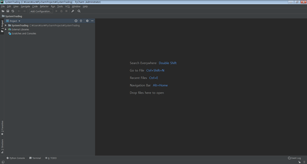 드디어 Pycharm 프로젝트를 시작합니다. 여기서 프로젝트란 우리가 트레이딩 시스템을 만들기 위한 작업 공간이라고 생각하시면 됩니다.