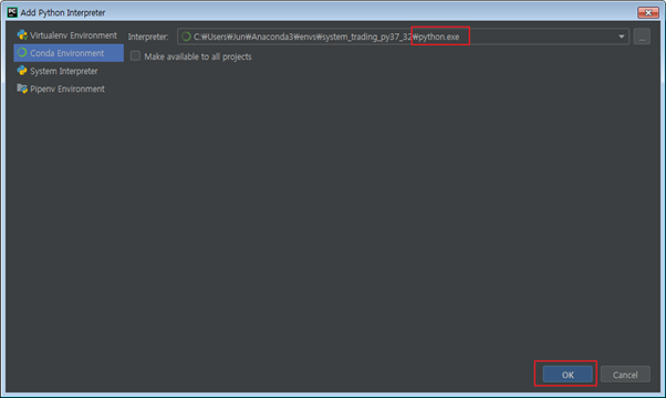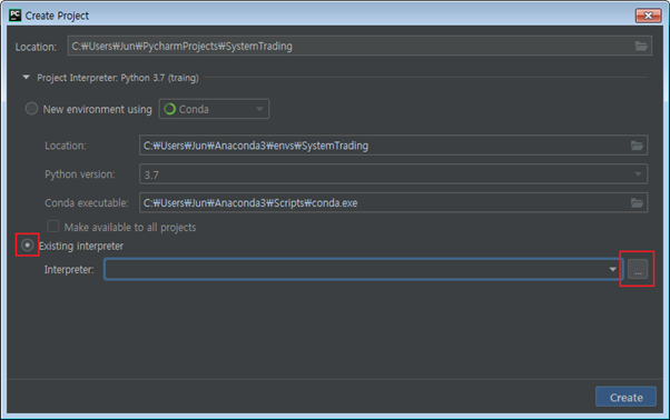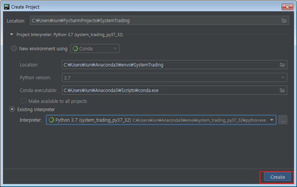 이전에 만들어둔 Anaconda 가상환경(system_trading_py37_32)과 방금 만든 프로젝트(SystemTrading)를 연결하는 작업이 필요합니다.