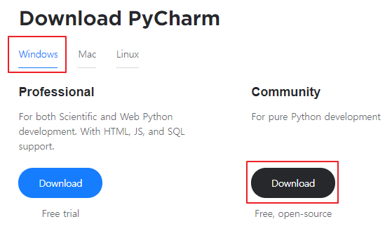 Windows, Mac, Linux에서 자신의 OS에 맞게 선택한 후 Download를 클릭합니다.