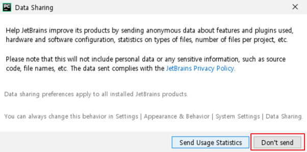 Pycharm의 문제가 발생하는 상황에서 개발사인 JetBrain으로 데이터를 제공해줄 것인지 묻는 창입니다.