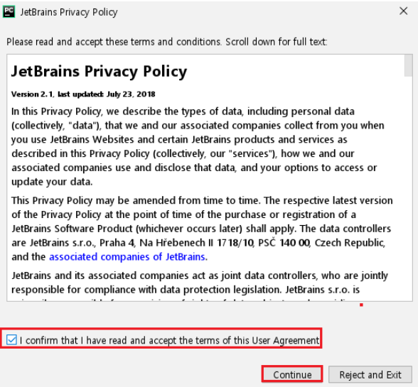 Pycharm 개발사인 JetBrains의 이용약관입니다. 동의 후 Continue를 누릅니다.
