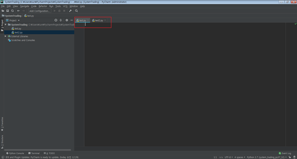 test.py를 생성한 직후 아무것도 하지 않아도 test.py에 코드를 만들 수 있도록 창이 활성화 되어 있습니다.