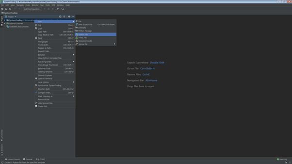 아래 캡쳐 이미지가 조금 작을 수도 있지만 프로젝트 영역 아무 곳에서 마우스 우클릭 > New > Python을 클릭합니다.