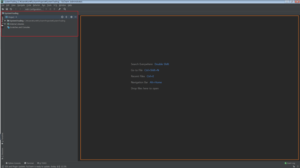 Pycharm내 프로젝트 창을 보면 크게 왼쪽 영역과 오른쪽 영역으로 구분지을 수 있습니다.