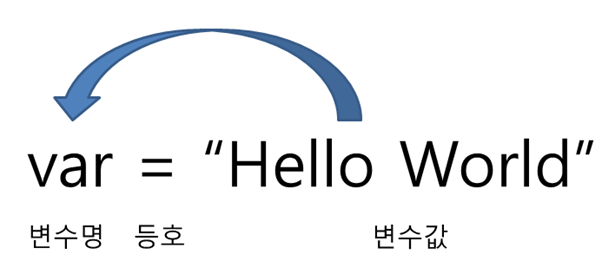 위 예시 코드에서는 “Hello World”를 그대로 타이핑하지 않고 var 라는 곳에 저장해두었다가 사용했습니다. 여기서 var를 변수라고 부르며 변수에 값을 넣어서 꺼내 사용할 수 있습니다.