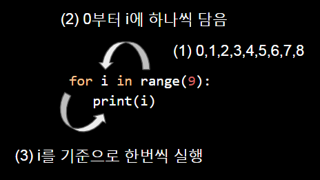먼저 변수의 이름은 마음대로 정해도 좋습니다. 저는 i를 사용했지만 다른 이름을 사용하셔도 무방합니다. i가 무엇인지 확인하기 위해 출력한 결과를 보면 range(9)에 들어있는 숫자 0부터 8까지를 순서대로 i라는 변수에 대입시켰다는 것을 알 수 있습니다. 이 과정을 그림으로 정리해보겠습니다.