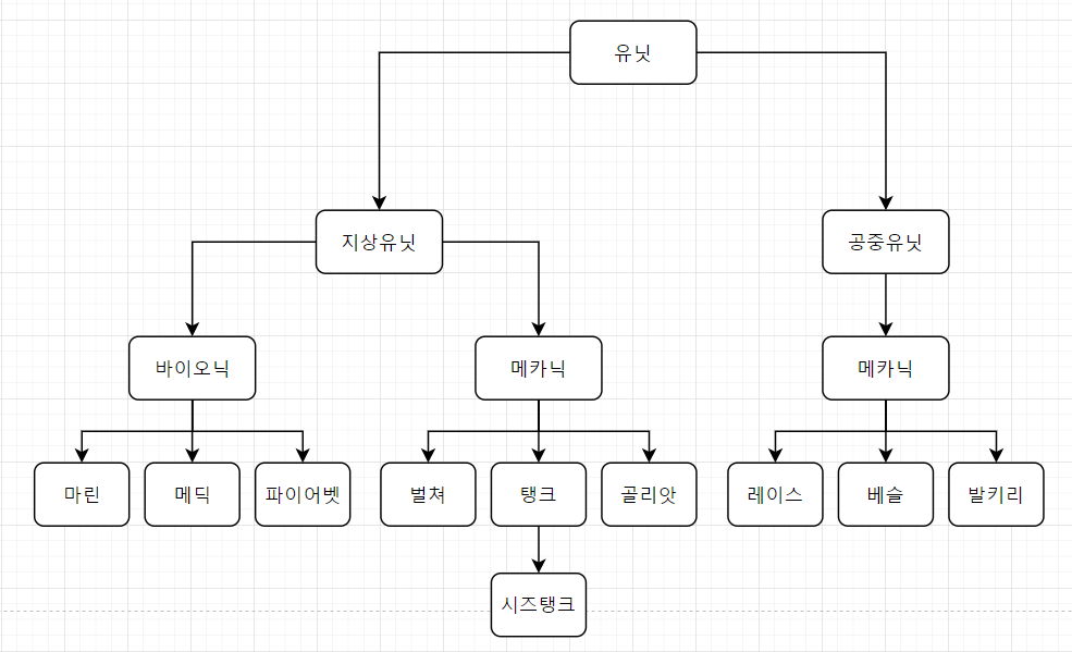이렇게 유닛이라는 기본 틀에서 지상유닛, 공중유닛로 세분화하고 이후 또 세분화하면서 구체적인 유닛으로 나뉘어지게 됩니다.
