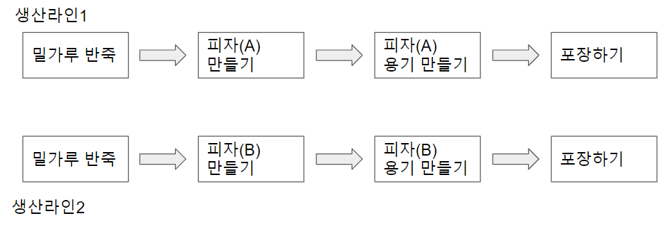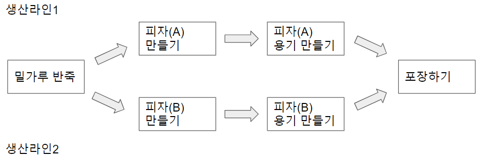 하지만 잘 생각해보면 피자를 만드는 것과 용기를 만드는 것은 피자마다 고유한 작업이지만 밀가루 반죽이나 포장같은 경우는 생산라인마다 분리하지 않고 하나로 묶어서 할 수 있는 작업입니다.