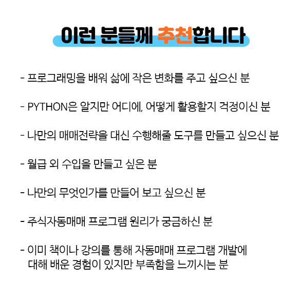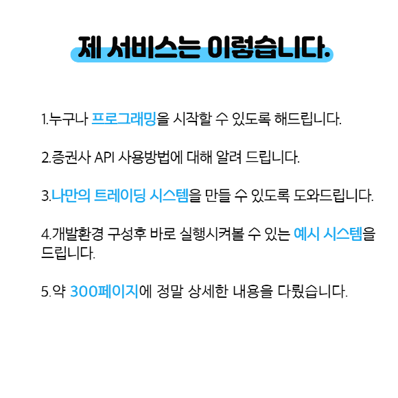 책의 모토는 프로그래밍을 한 번도 해보지 않으신 분들이 Python 기초부터 증권사 API를 이용해 매매가 가능한 프로그램을 개발하도록 도와드리는 것입니다. 이런 뜻을 두고 최대한 친절하고 상세한 설명을 제공해드립니다.