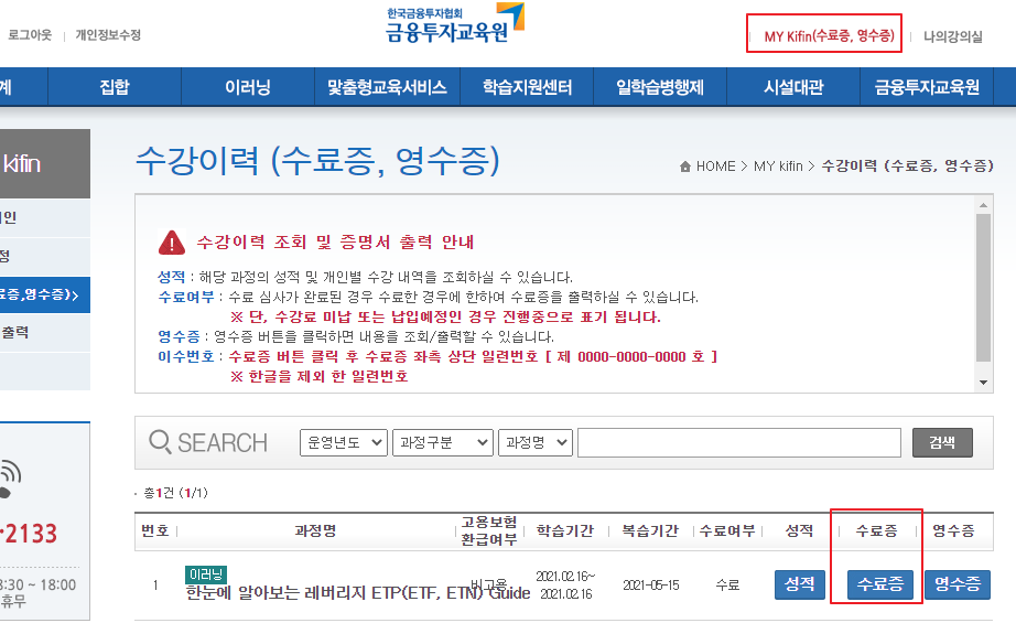 수료증 클릭하면 아래처럼 수료증 번호가 나옵니다. 이 상태에서 영웅문에 접속합니다.