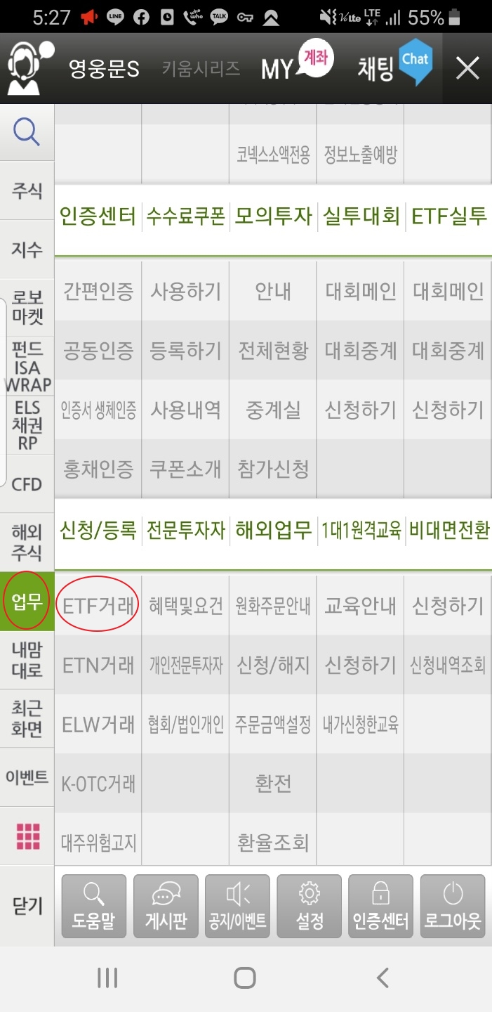 12.메뉴 > 업무 > 아래로 스크롤 > ETF 거래 클릭
