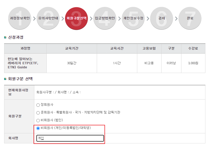 6.회원구분 선택(비회원, 개인)> 회사명 입력(개인)