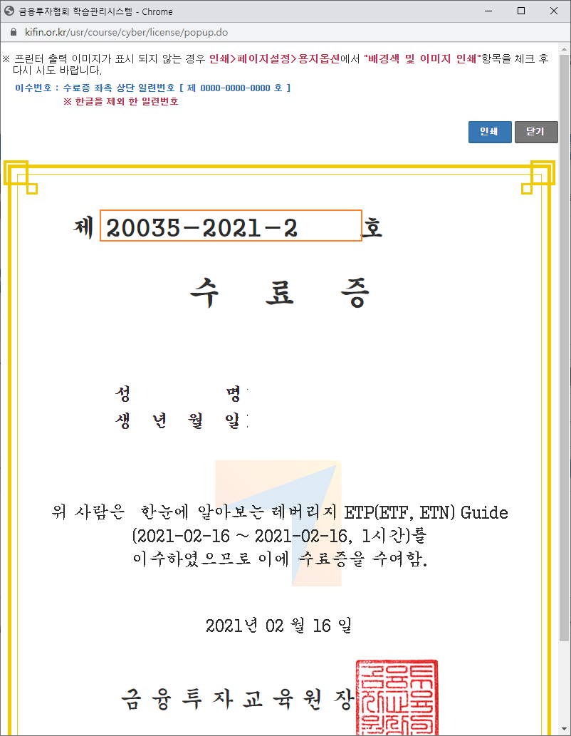 수료증 클릭하면 아래처럼 수료증 번호가 나옵니다. 이 상태에서 영웅문에 접속합니다.
