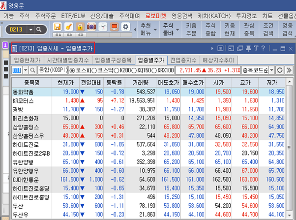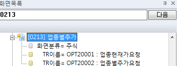 업종별주가를 확인하는 메뉴창의 번호가 0213이고 이를 화면번호라고 부릅니다. 그리고 KOA 화면목록 탭에서 0213을 검색해보면 다음과 같이 나옵니다.