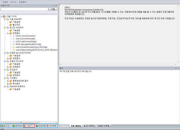 (4)TR목록: TR은 Transaction의 약자이며 여기서 거래란 흔히 알고 있는 의미로 교환, 매매를 의미하지 않고 요청, 행위를 거래라고 합니다. 위에 캡쳐 화면에서 OPT20001은 TR 중 하나이며 TR목록은 우리가 요청할 수 있는 거래 목록을 나타냅니다.